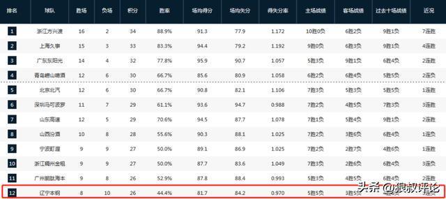新赛季至今,辽宁取得8胜10负的战绩,跌至积分榜第12名。