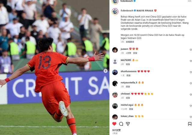 王博豪太有牌面了,荷乙邓伯什发布王博豪即将代表中国队出战U23亚洲杯决赛的动态,而且这是本届U23亚洲杯上,连续第3次发布王博豪与中国U23的消息,1天内已经获得超800个赞,王博豪成为荷乙邓伯什上下高度关注的中国明星,估计这下回荷兰真要坐稳主力了。